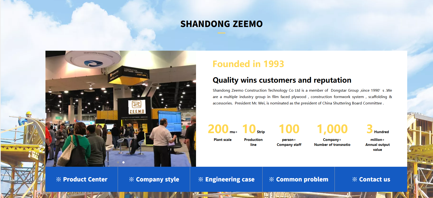 Шаньдун Zeemo Construction Technology Co Ltd является членом Dongstar Group, многочисленной отраслевой группы по производству пленочной фанеры, систем строительной опалубки, строительных лесов и аксессуаров. Президент г-н Вэй назначен президентом Комитета Совета по опалубке Китая.
