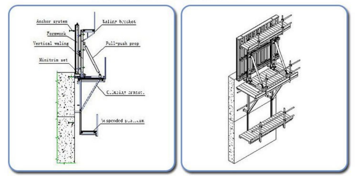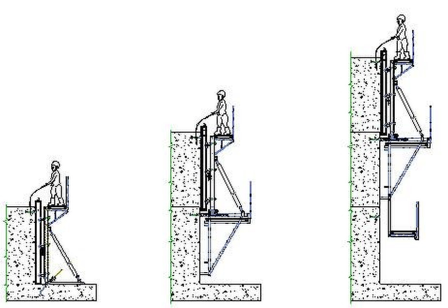 Закрепите подвесную платформу под всей системой, рабочие могут удалить растяжимый болт и V-образный подъемный конус на платформе, а затем заполнить отверстия, оставленные V-образным подъемным конусом.Последующие подъемы являются стандартными, как и второй подъем, пока не будет закончено бетонирование.