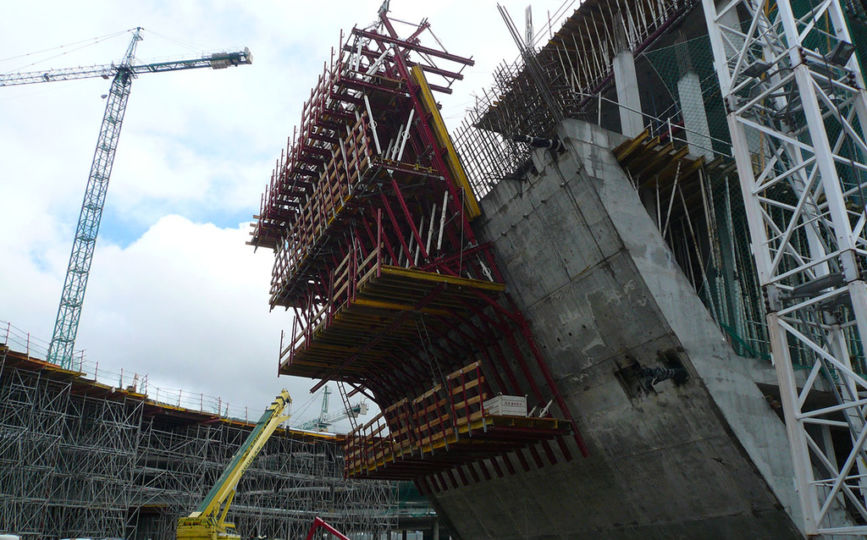 Стеновая опалубка поднимается в одностороннем порядке с помощью подъемных консолей.