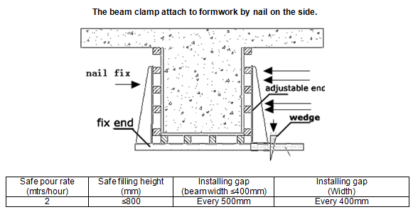 Чтобы закрепить опалубку для балки, выберите доступный зажим для балки нужного размера, от 200 мм до 600 мм, приложите фиксирующий конец и дно к опалубке.Прижмите регулируемый конец к другому стороны балки, вставьте клин и закрепите зажим, постукивая по клину молотком.
